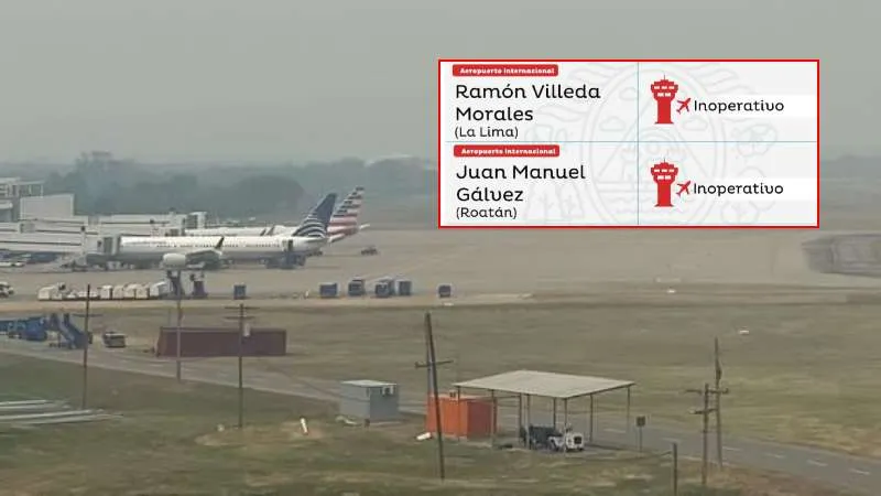 Los aeropuertos Ramón Villeda Morales en La Lima y Juan Manuel Gálvez en Roatán, Islas de la Bahía, han sido cerrados temporalmente debido a una densa capa de humo que afecta el territorio hondureño.